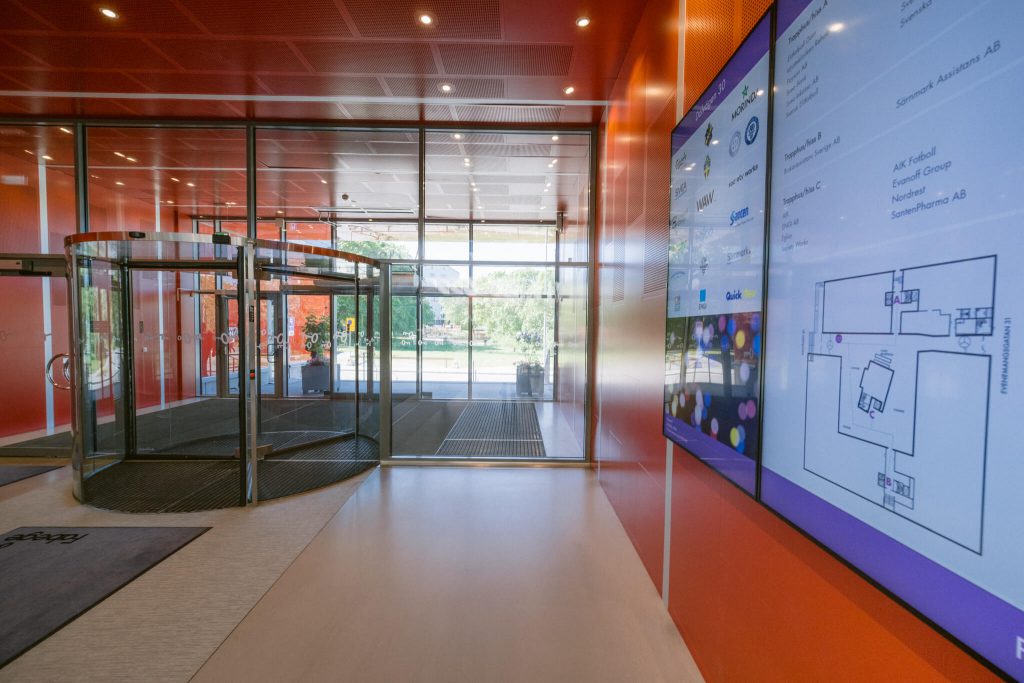Fabege har satt upp digitala skyltar i sin entré där varje hyresgäst syns tydligt och besökarna kan enkelt hitta dit de ska. Vill fastighetsägaren sedan lägga in underhållsinfo av fastigheten eller tider för kollektivtrafik så kan de enkelt göra det.