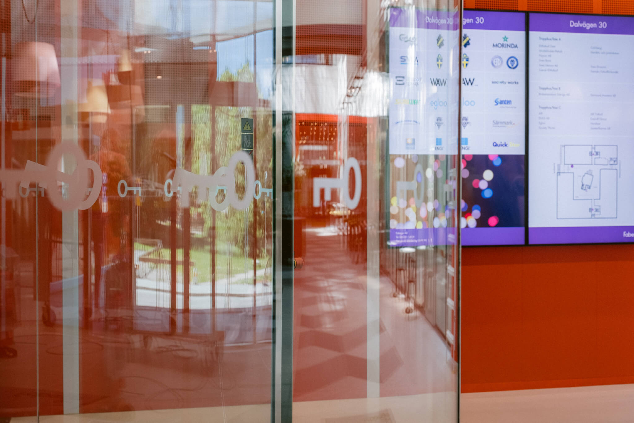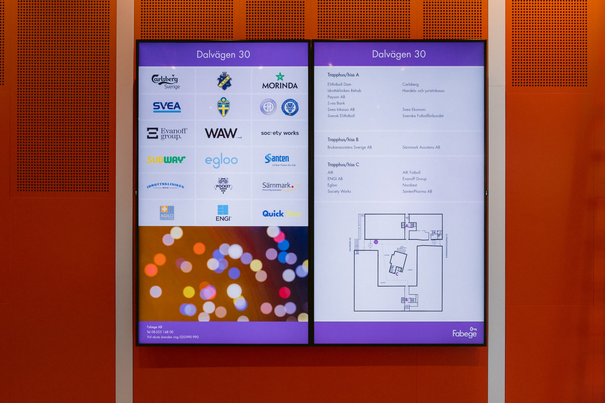 Fabege har satt upp digitala skyltar i sin entré där varje hyresgäst syns tydligt och besökarna kan enkelt hitta dit de ska. Vill fastighetsägaren sedan lägga in underhållsinfo av fastigheten eller tider för kollektivtrafik så kan de enkelt göra det.