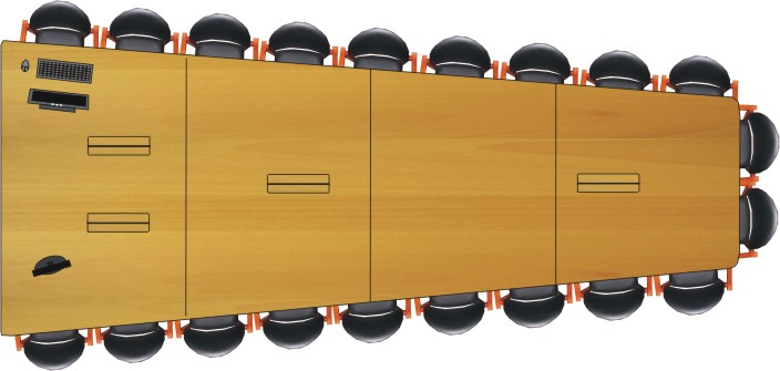 Vi var inte nöjda med de traditionella konferensbord som fanns på marknaden, då det ofta blev problem vid presentationer då man vänder mot presentationen. Stolar flyttades kors och tvärs och man försökte se över axeln på bordsgrannen.