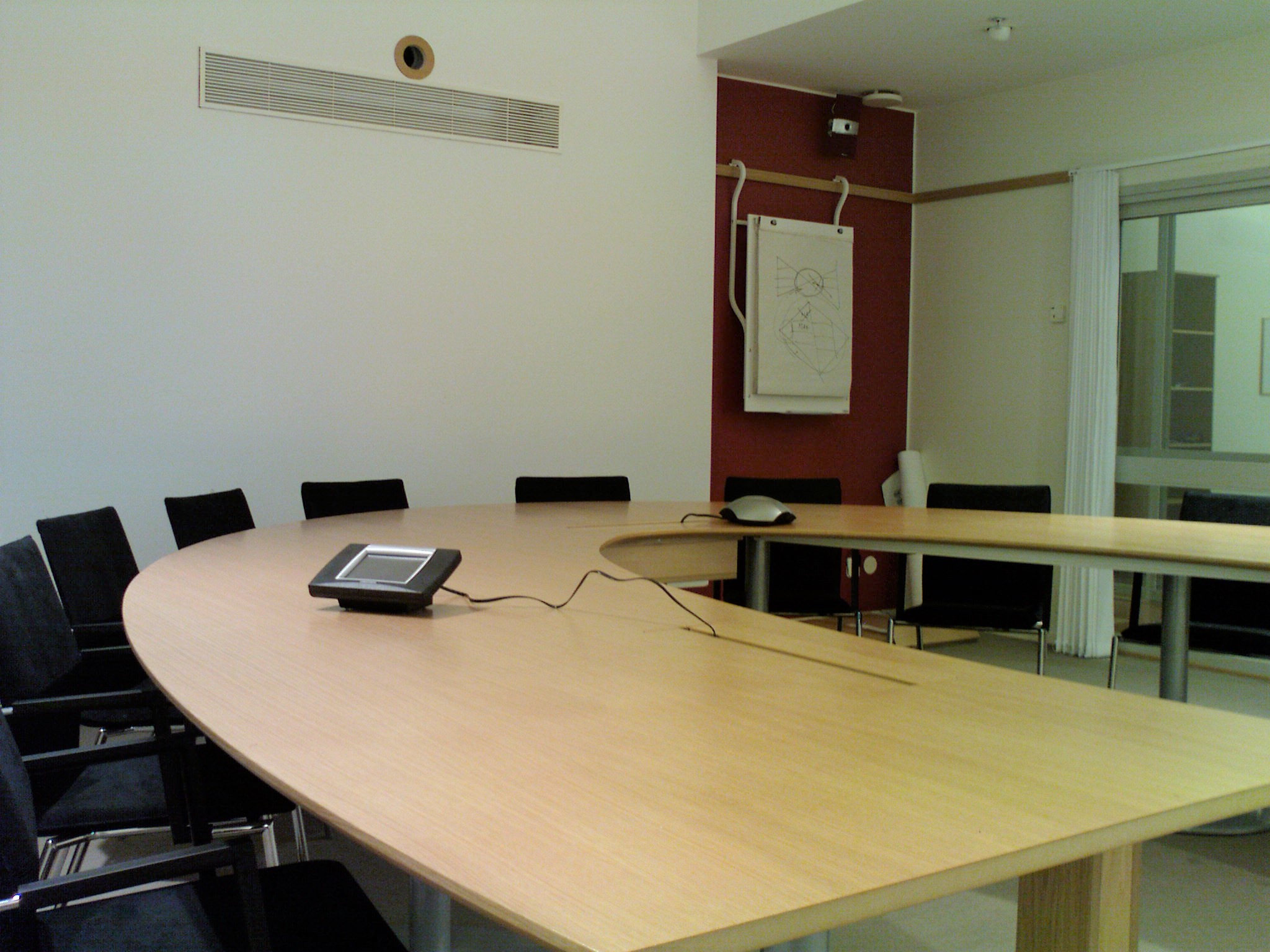 Genom att konstruera ett bord som är smalare i den ände som är längst från bildytan och som blir bredare ju närmare bilden man kommer så får alla samma möjlighet att följa presentationen eller synas i videomötet.