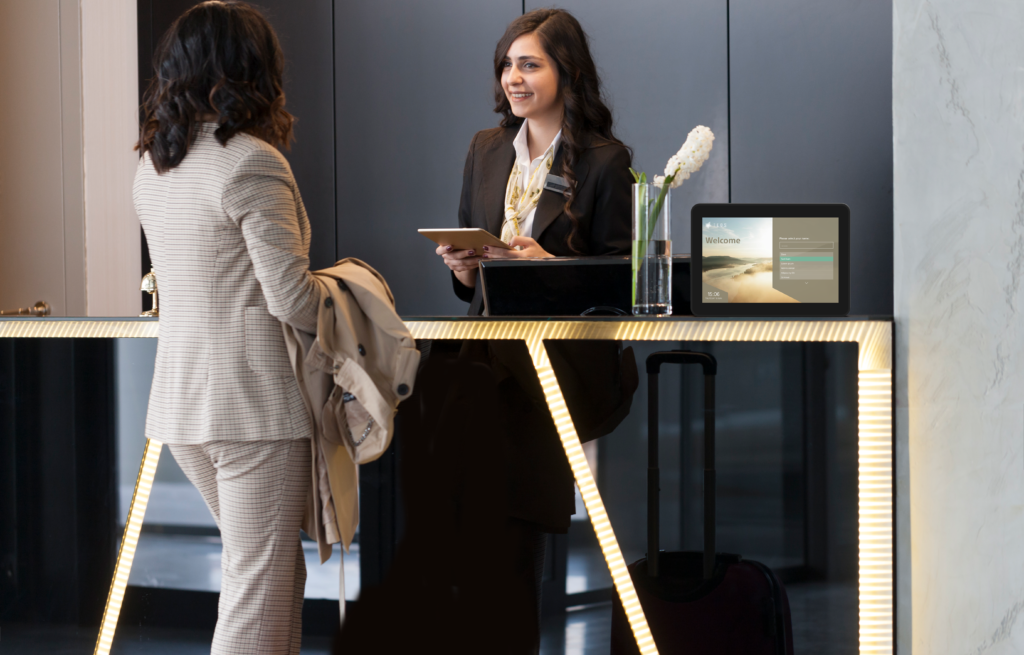 Auto check in för besökare där anställd får sms/mail när besökaren anlänt. Kan kopplas till etikettskrivare för besökstag.